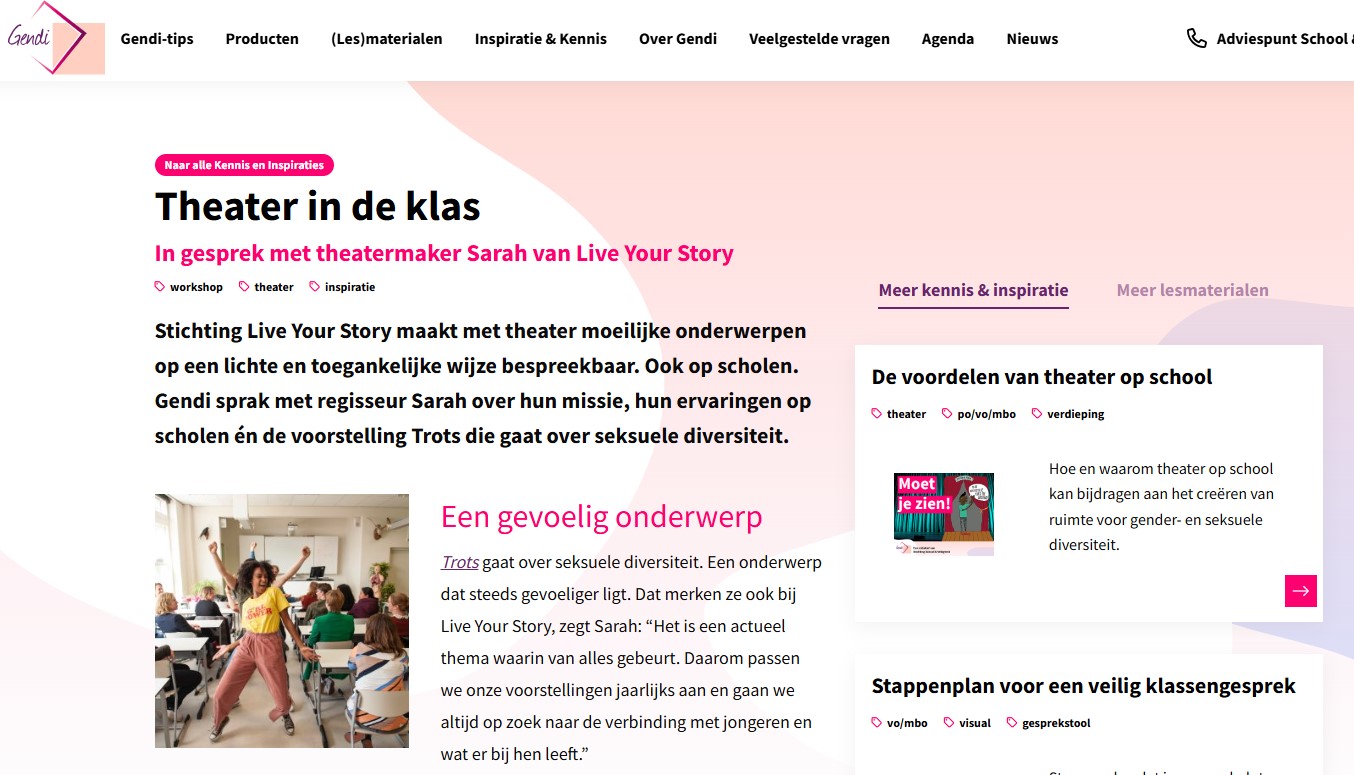 Gendi, september 2024 | Gendi interviewde theatermaker Sarah over schooltheater met betrekking tot lhbti+-onderwerpen. “We merken dat het voor leraren fijn is dat wij onderwerpen behandelen die gevoelig liggen,” zegt Sarah. “Niet iedere leraar voelt zich vrij om die aan te snijden. Wij hebben de luxe dat we komen en weer gaan. Daardoor kunnen wij oprechter en makkelijker ingaan op moeilijke vragen. En confronterende gesprekken voeren met leerlingen.”