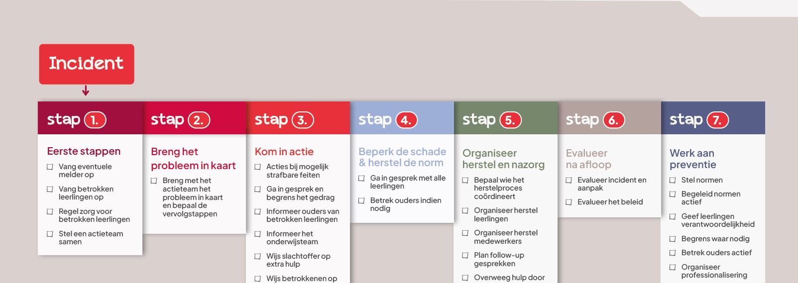 Het stappenplan richt zich specifiek op online incidenten tussen leerlingen (en hiermee bedoelen we ook mbo-studenten). Situaties waarbij ouders of leraren direct betrokkenen zijn, vallen buiten dit stappenplan. De nadruk ligt op het vaststellen van online normen en op het herstellen van de veiligheid op school, ook als de aanstichter niet te identificeren is.