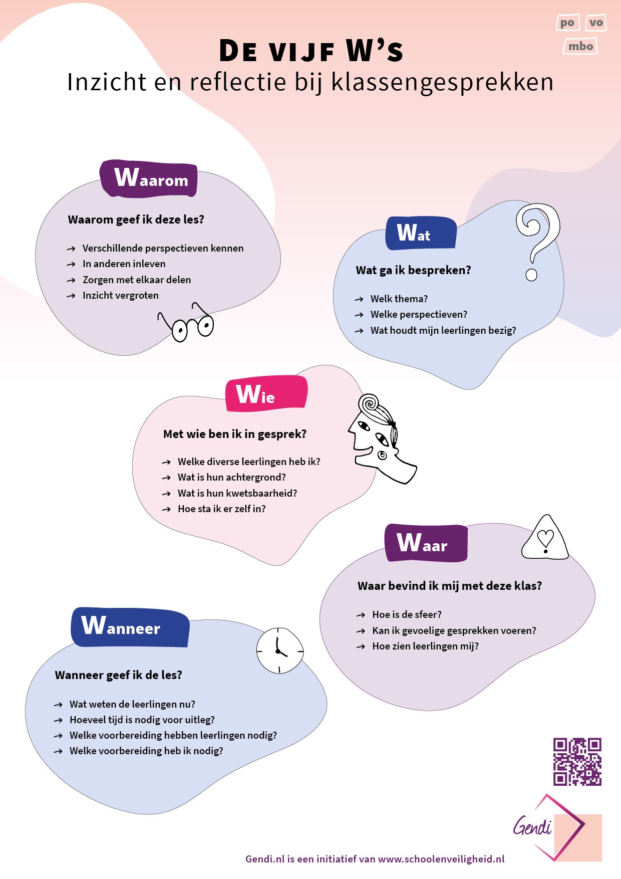 adviespunt@schoolenveiligheid.nl 030 285 66 16 Meer informatieDe vijf W’s geven inzicht in factoren die een rol spelen bij lastige gesprekken in de klas, bijvoorbeeld over gender- en seksuele diversiteit. De visual geeft uitleg bij de vijf W’s en biedt een simpele voorbereiding op ieder lastig gesprek én helpt je achteraf te reflecteren. De visual is gratis te downloaden. Bekijk ook de andere visuals van Gendi.