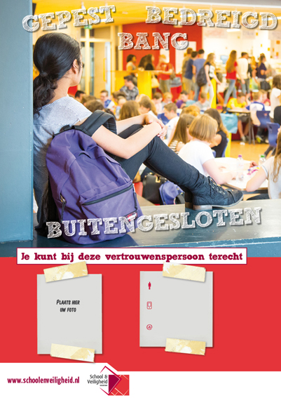 adviespunt@schoolenveiligheid.nl 030 285 66 16 Meer informatieMet deze voorlichtingsposters weten leerlingen de weg te vinden naar de vertrouwenspersoon en het aanspreekpunt pesten op school. Zo weten leerlingen bij wie ze kunnen aankloppen als ze met ongewenst gedrag zoals pesten te maken krijgen. In het mbo is het geven van voorlichting om ongewenst gedrag te voorkomen zelfs verplicht op basis van de cao-mbo. Deze posters kunnen daar een onderdeel van zijn.